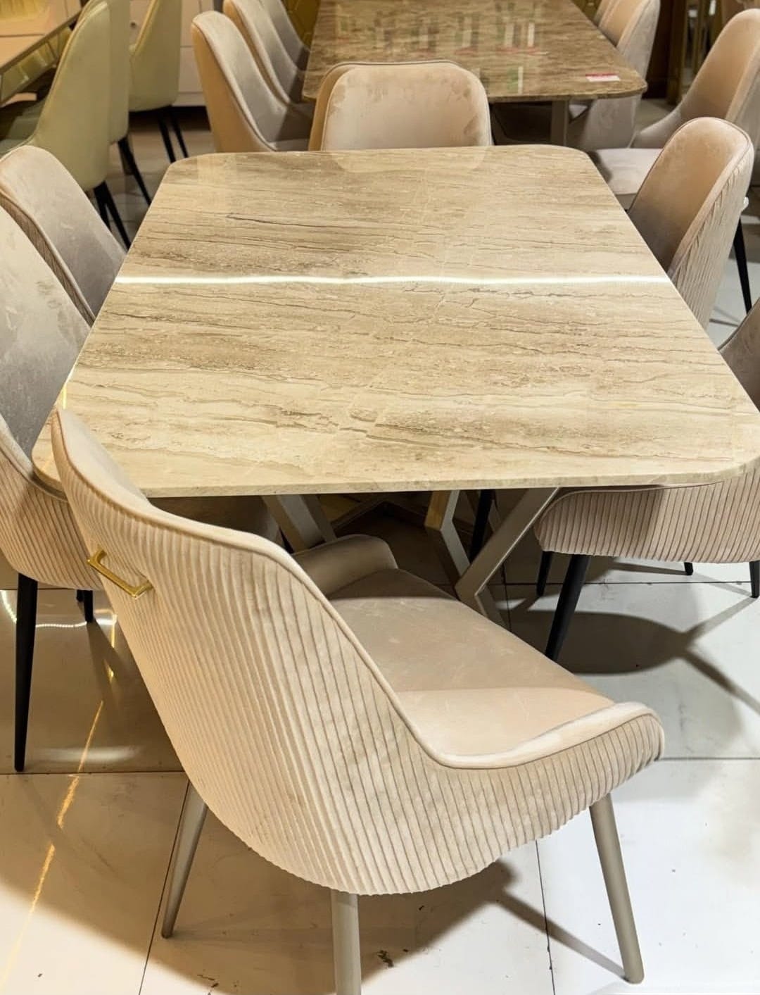 The dining chairs are upholstered in high-quality suede fabric, providing soft seating comfort along with an elegant look that complements the marble top beautifully.