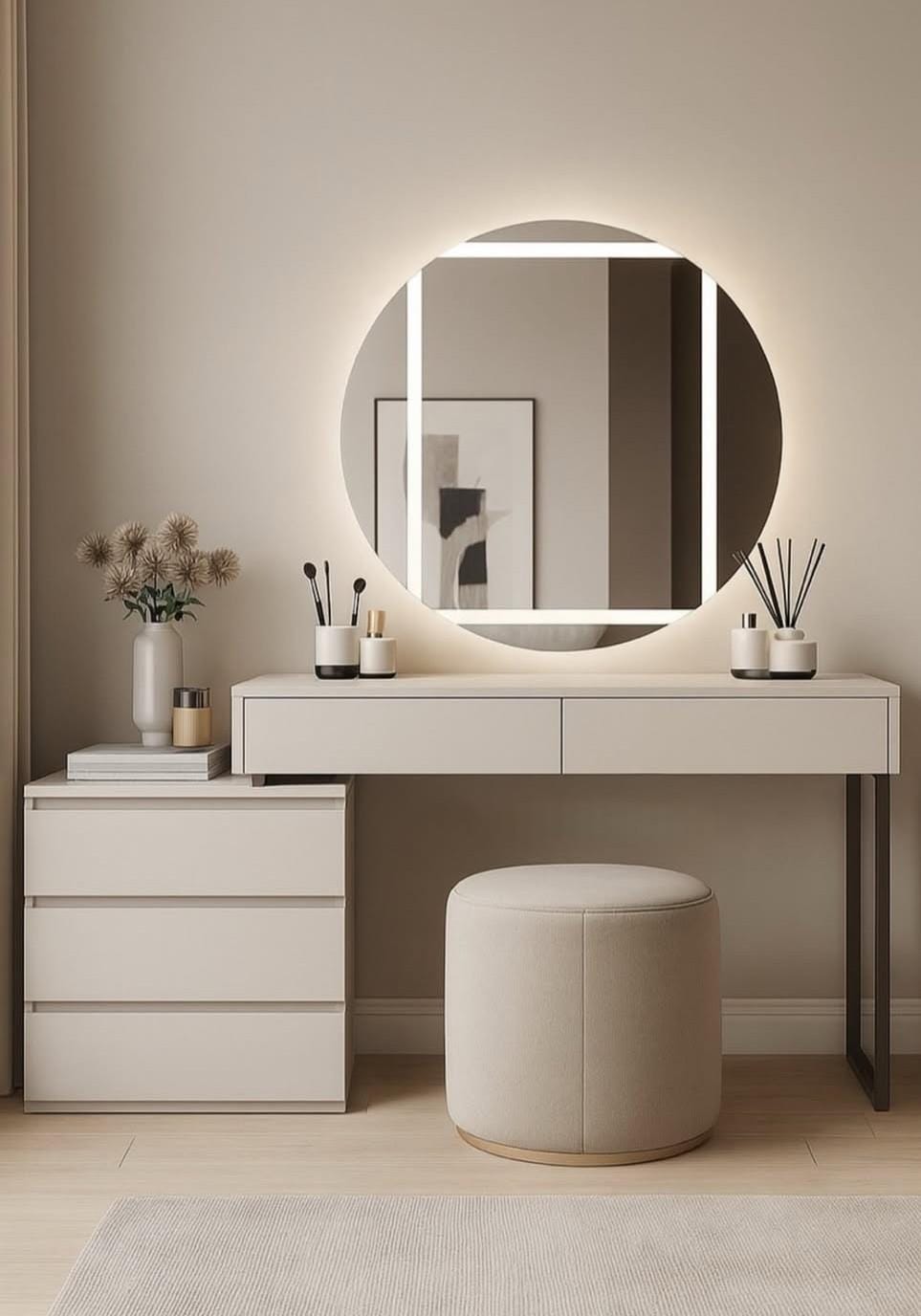This dressing table comes with multiple drawers for organised storage, a full-size mirror, and a comfortable sitting stool, making your daily grooming routine effortless and stylish. Whether you are getting ready for work or a special occasion, this dressing table offers both functionality and aesthetic appeal.